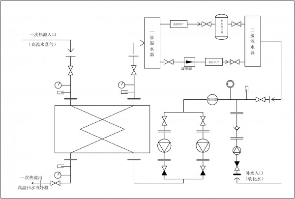 JHY高低區(qū)復(fù)合式采暖機(jī)組是將原高層直連設(shè)備內(nèi)的平衡阻斷裝置安裝在換熱機(jī)組內(nèi),利用換熱器的二次出水,直接投送到采暖系統(tǒng),其原理是用二次出水接入分區(qū)混水器,通過混水器后調(diào)壓向高、中、低三套系統(tǒng)進(jìn)行加壓循環(huán)供水。根據(jù)高區(qū)供水壓力選擇補(bǔ)水泵功率與揚(yáng)程,且高區(qū)回水至設(shè)備前先進(jìn)入智能平衡裝置,經(jīng)平衡裝置后進(jìn)入換熱器,實(shí)現(xiàn)高區(qū)與低區(qū)平衡運(yùn)行。